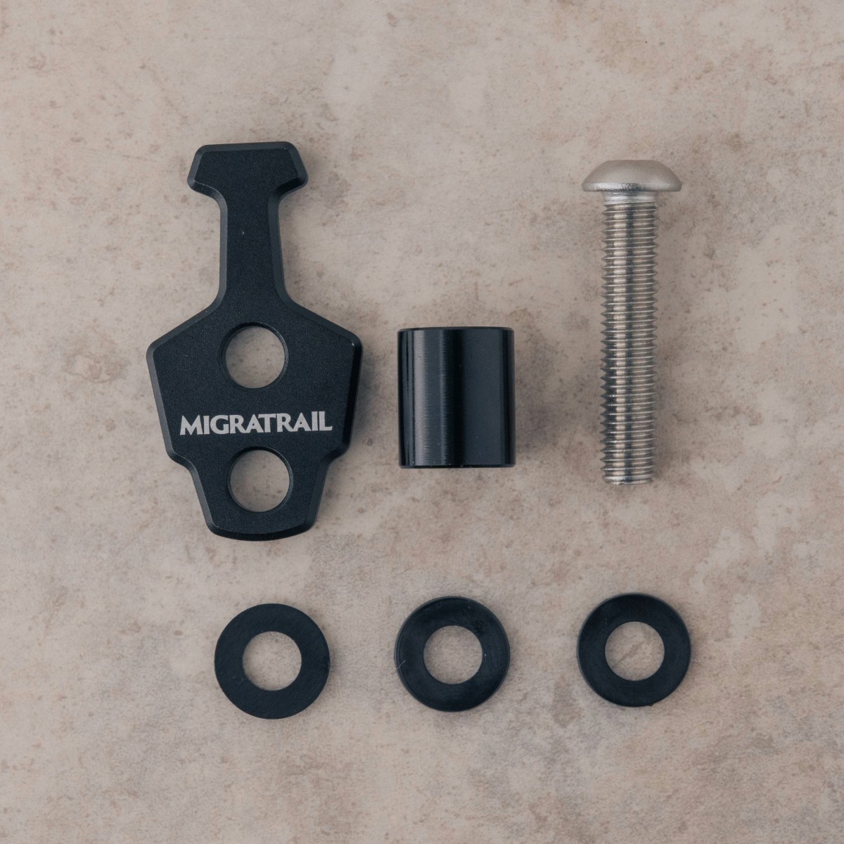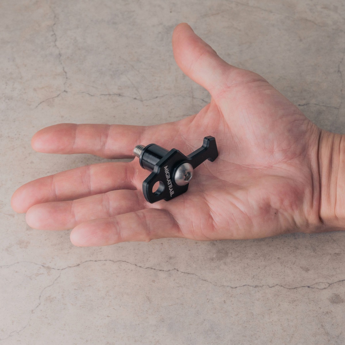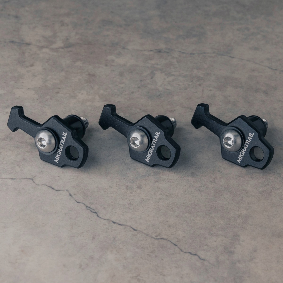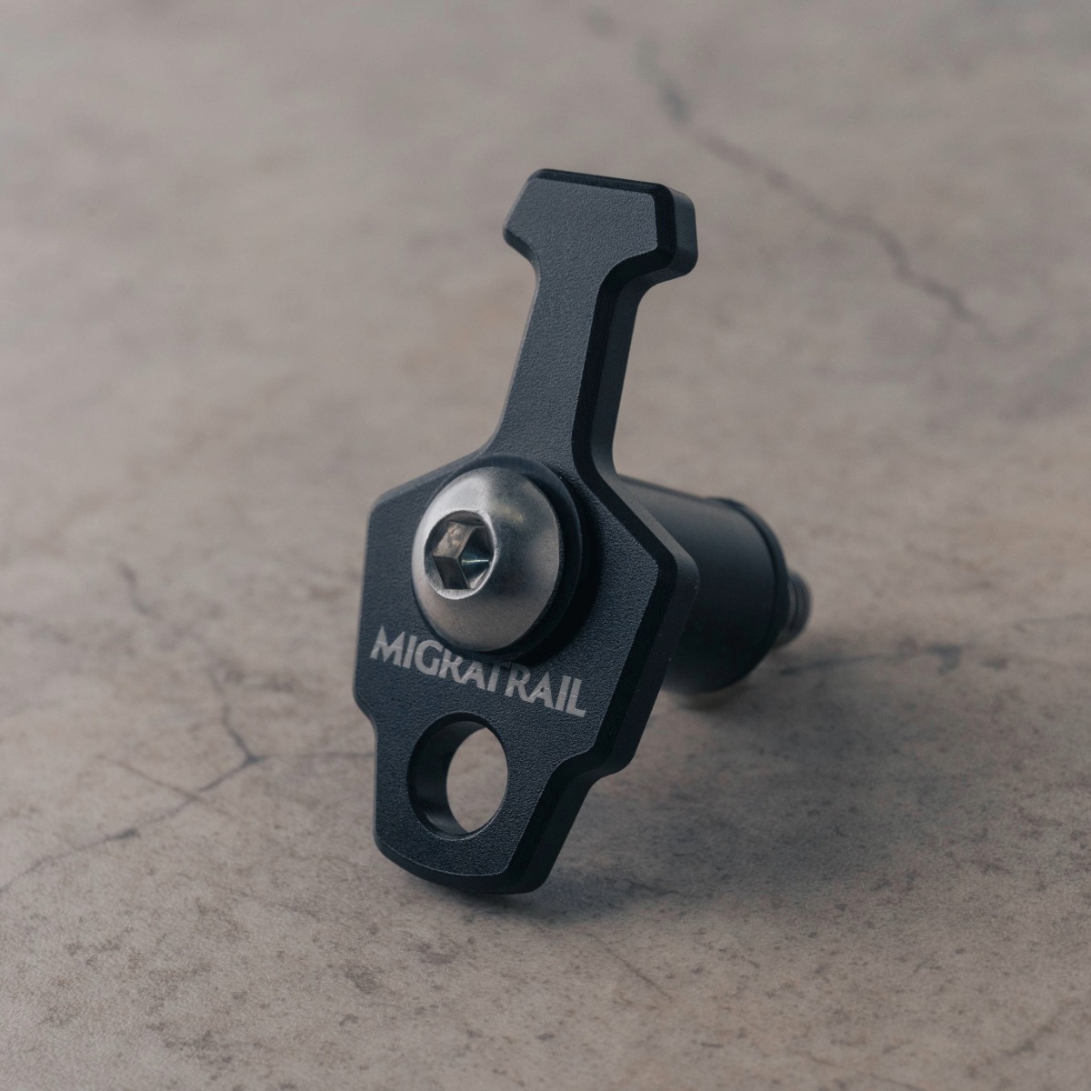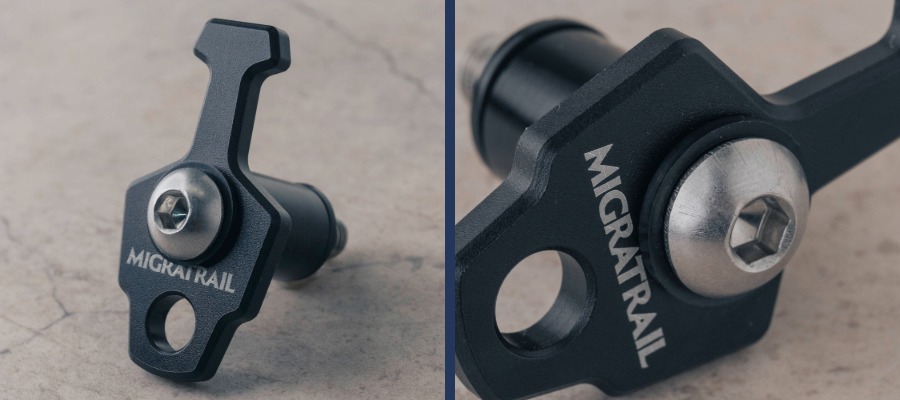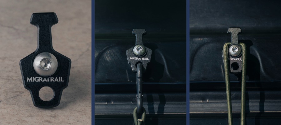フックプレートはガイロープやバンジーコードが掛けやすい形状。中心の穴はガイロープなどを強固に縛り付けることができ、DIYを考慮しM8ボルト用穴サイズに設計。