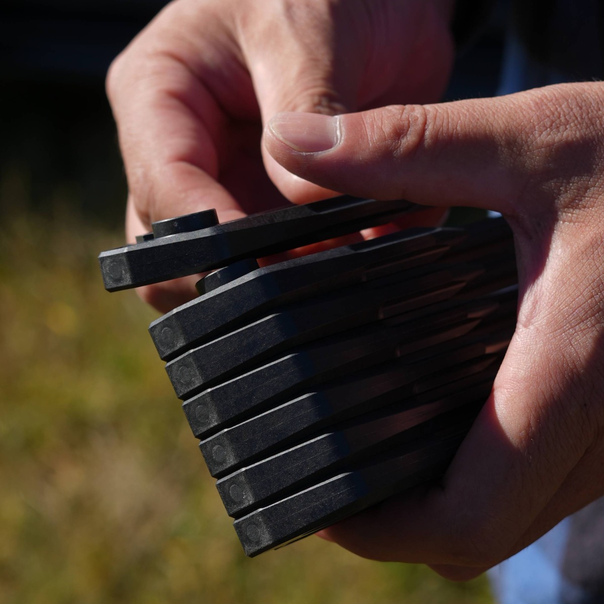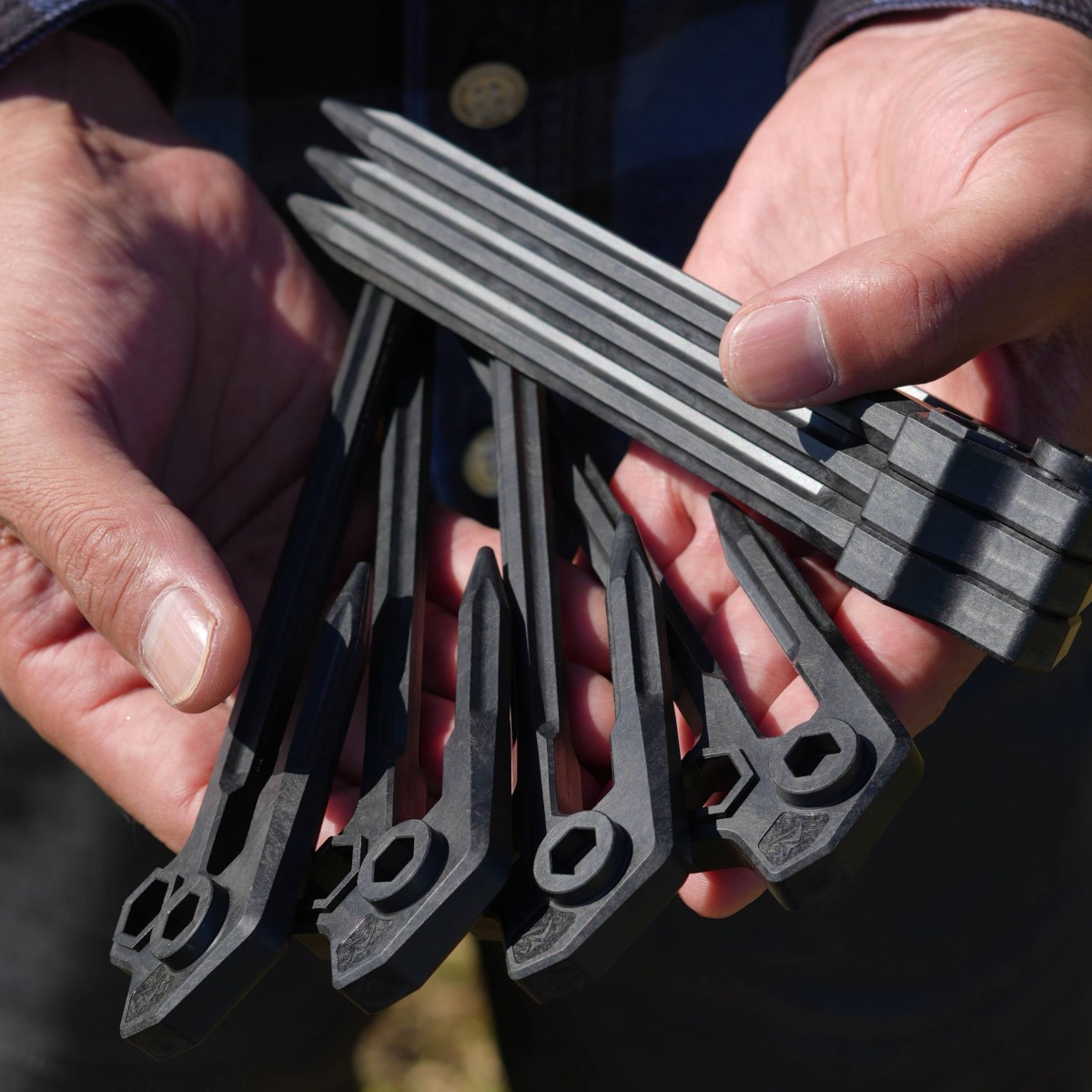 ペグ同士を複数本積み重ねて固定し、持ち運び時にしっかりとまとめて携帯可能。