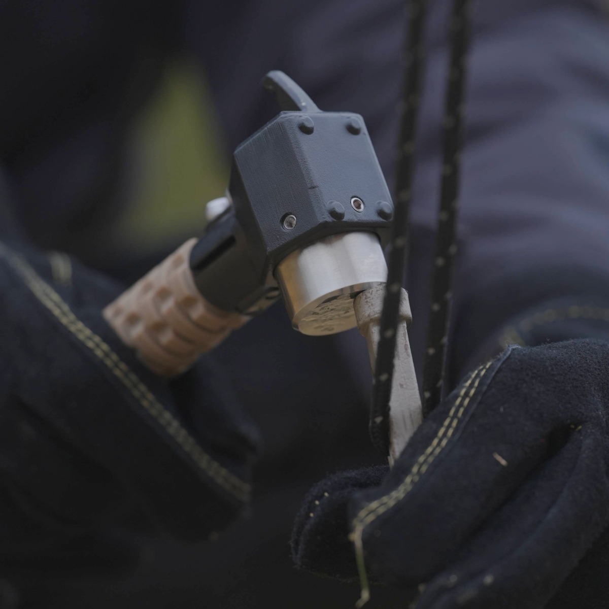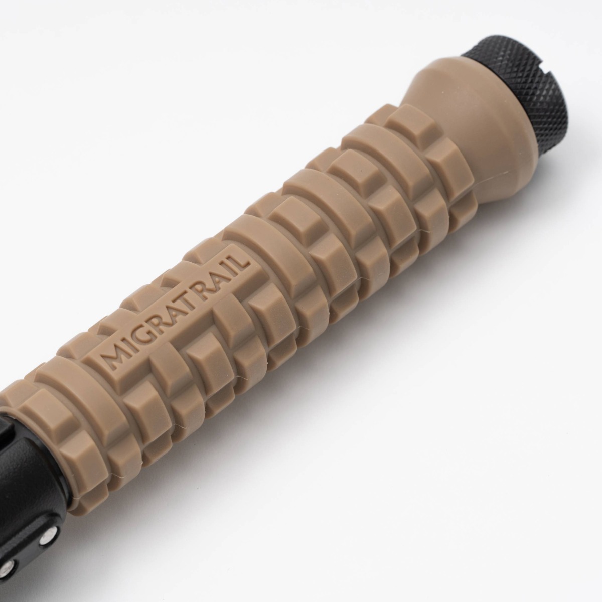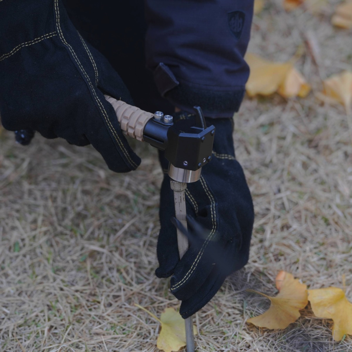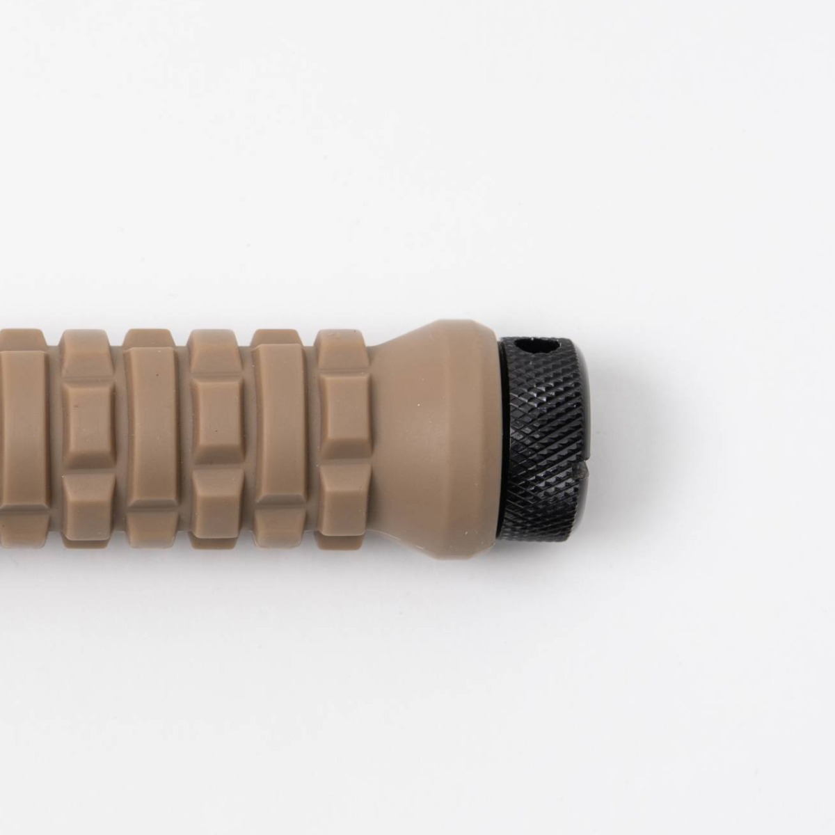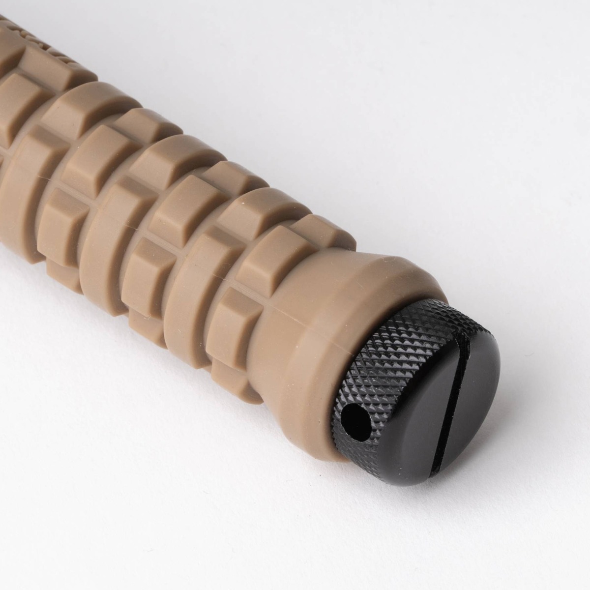 アルミ製エンドキャップはネジ式により開封が可能。グリップ内にエマージェンシーミニペグが4本入っており、タキビシート、グランドシート、テントスカート等に利用可能。※ペグには返しがございません。地面に対して斜めに差し込んでご利用ください。