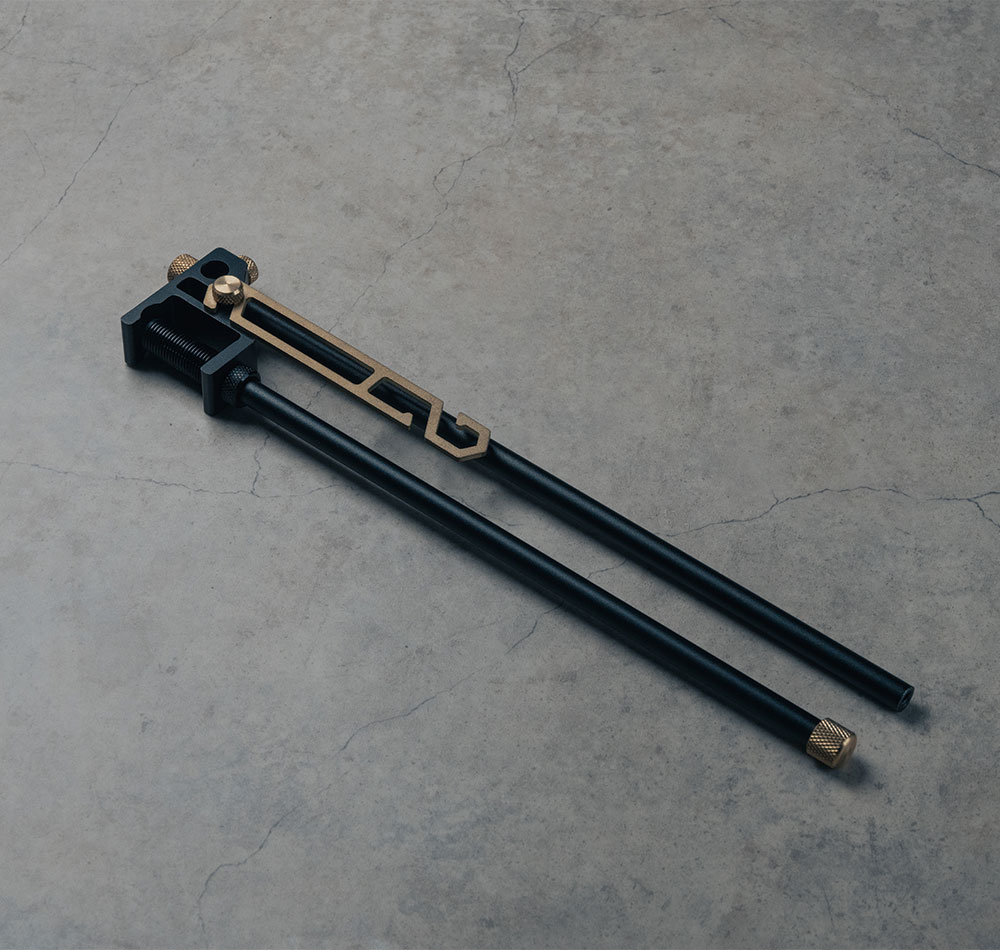 主要部品はアルミニウム合金を使用し、軽量に仕上げられている。表面仕上げはハーフマットブラックのアルマイト仕上げ。真鍮タイプはハンガー部、各ボルトが真鍮になっており、家のインテリアとしても馴染むデザイン。