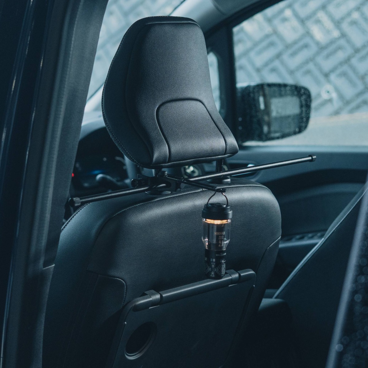 独自のクランプ構造はさまざまな場所に取付けができる。キャンプテーブル以外にも鍛造ペグやポール、車内のヘッドレストなど取付け場所はさまざま。