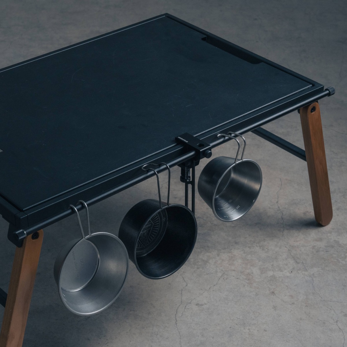キャンプテーブルでの使用時、状況に応じて縦型、横型から利用スタイルを選ぶことができる。縦型はランタンなどに利用でき、横型はシェラカップなどの小物を多く掛けたい場合に便利。