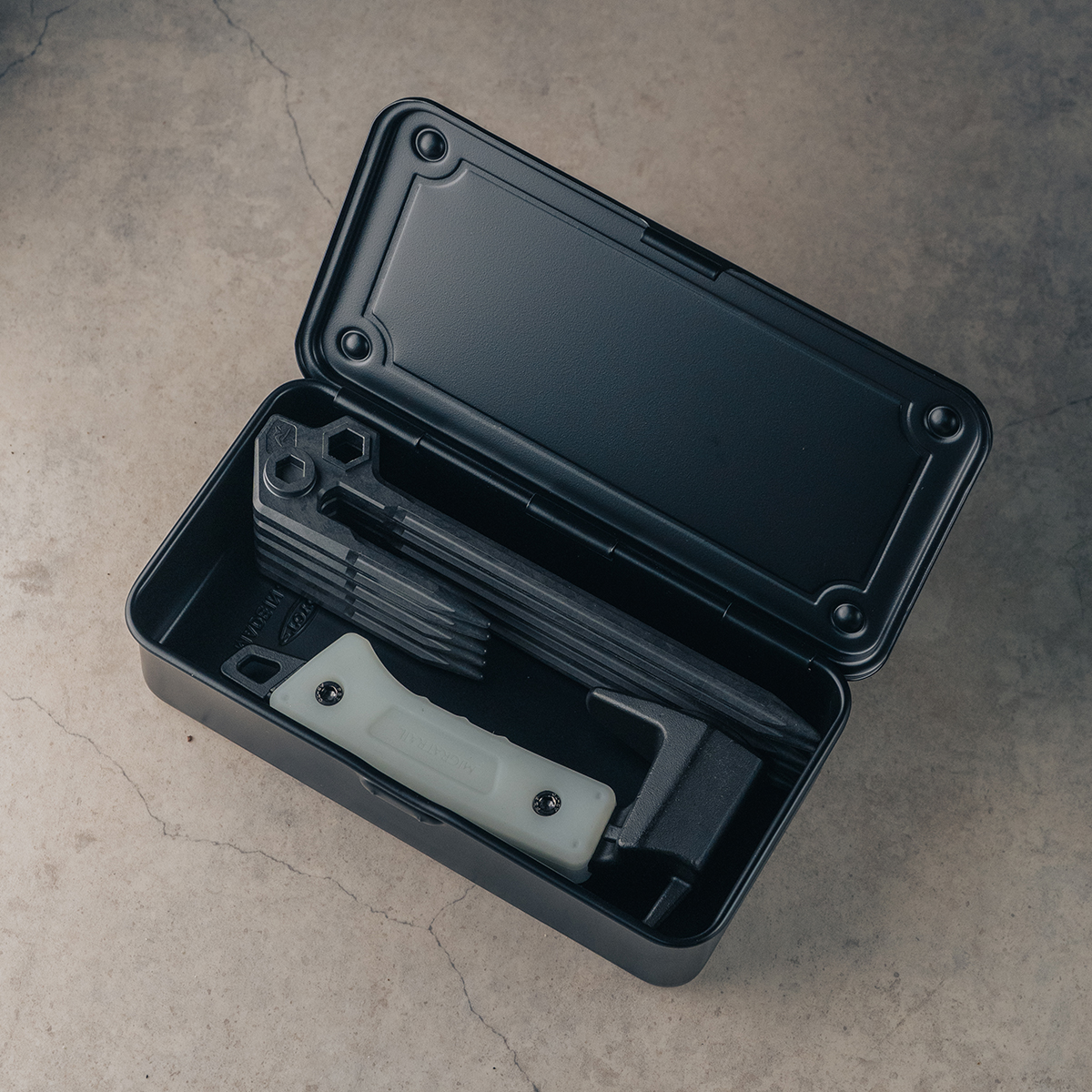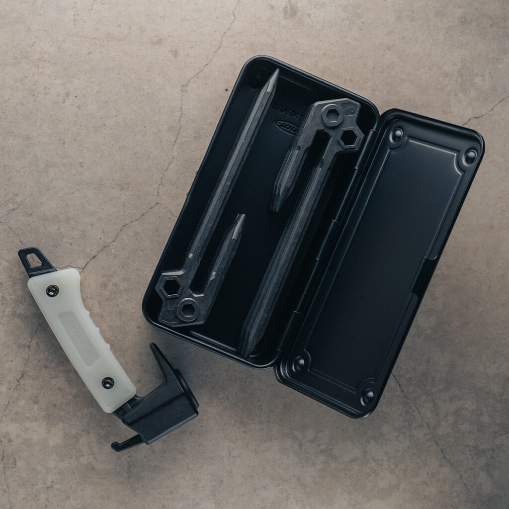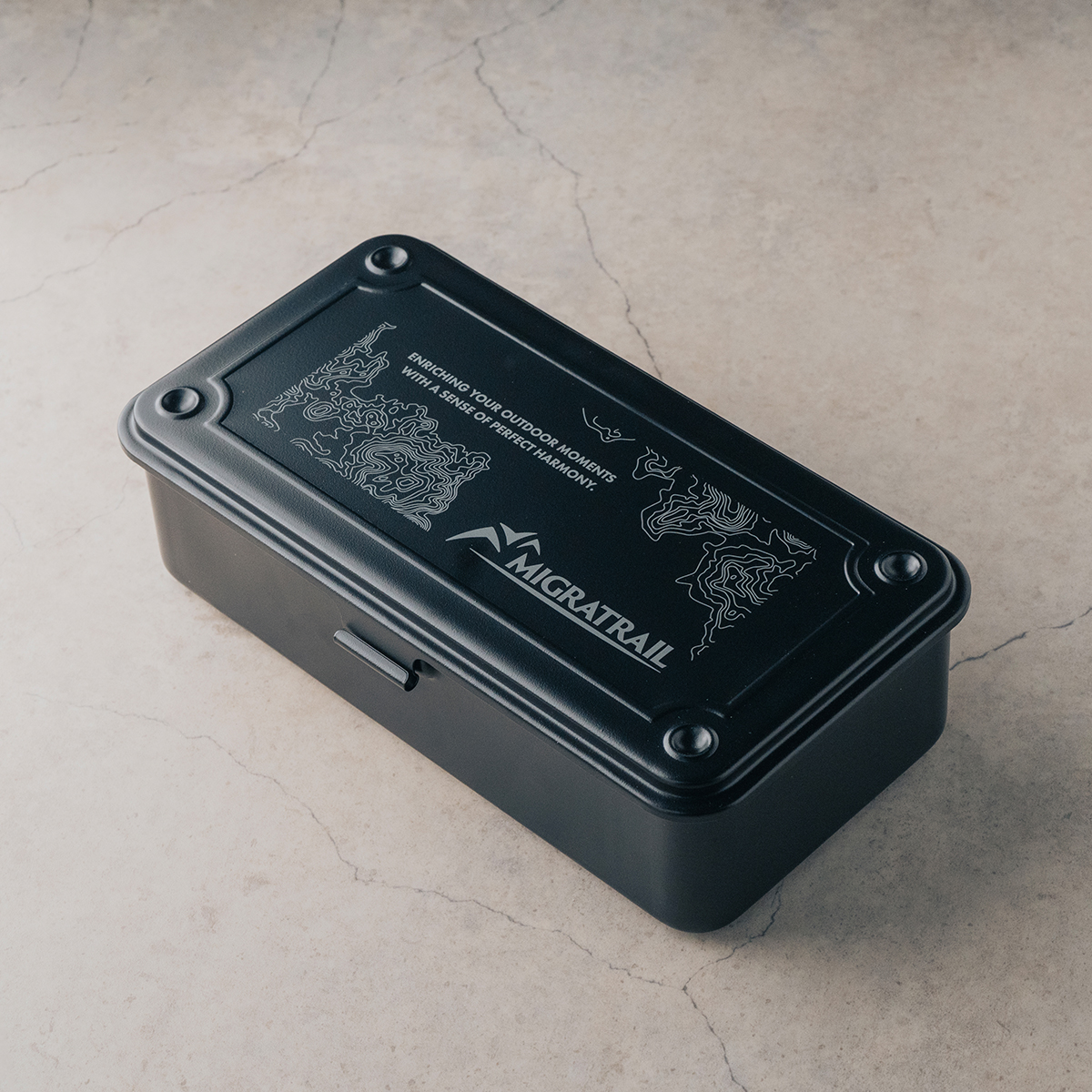 フィットハンマー専用のツールBOX付きを用意。TOYOスチールとコラボレーションしたMIGRATRAILオリジナルデザインのツールボックスと専用フォームが付属。専用フォームを外せばペグなどを入れるハードタイプのギアボックスにもなる。MIGRATRAILのペグ、ヘキサステークがジャストフィットで10本入れることが可能。フィットハンマーもツールボックスも使えば使うほど味わいがある存在になる。