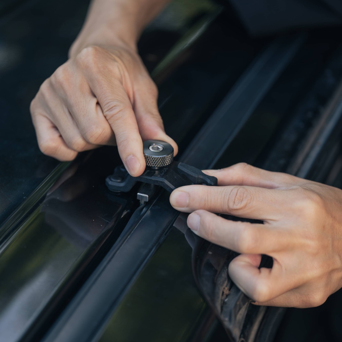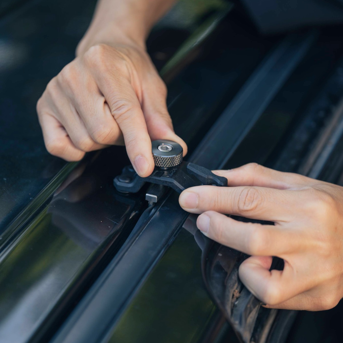 無加工で簡単で確実に固定できるカージョイントフック。ルーフレールカバーを取外すことなく装着でき、車両片側3カ所に工具を使うことなく取付け可能。