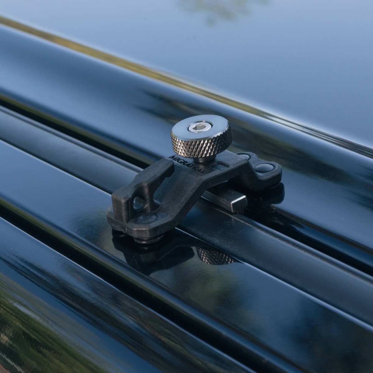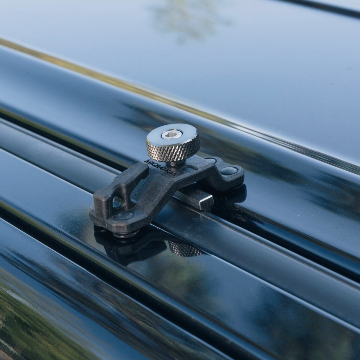 強度に優れた特殊樹脂を採用したボディは、軽量かつコンパクトなデザイン。車に接触する部位はラバーブッシュを配置し車体を傷付けない。特殊樹脂:ナイロンにグラスファイバーを織り交ぜた樹脂。