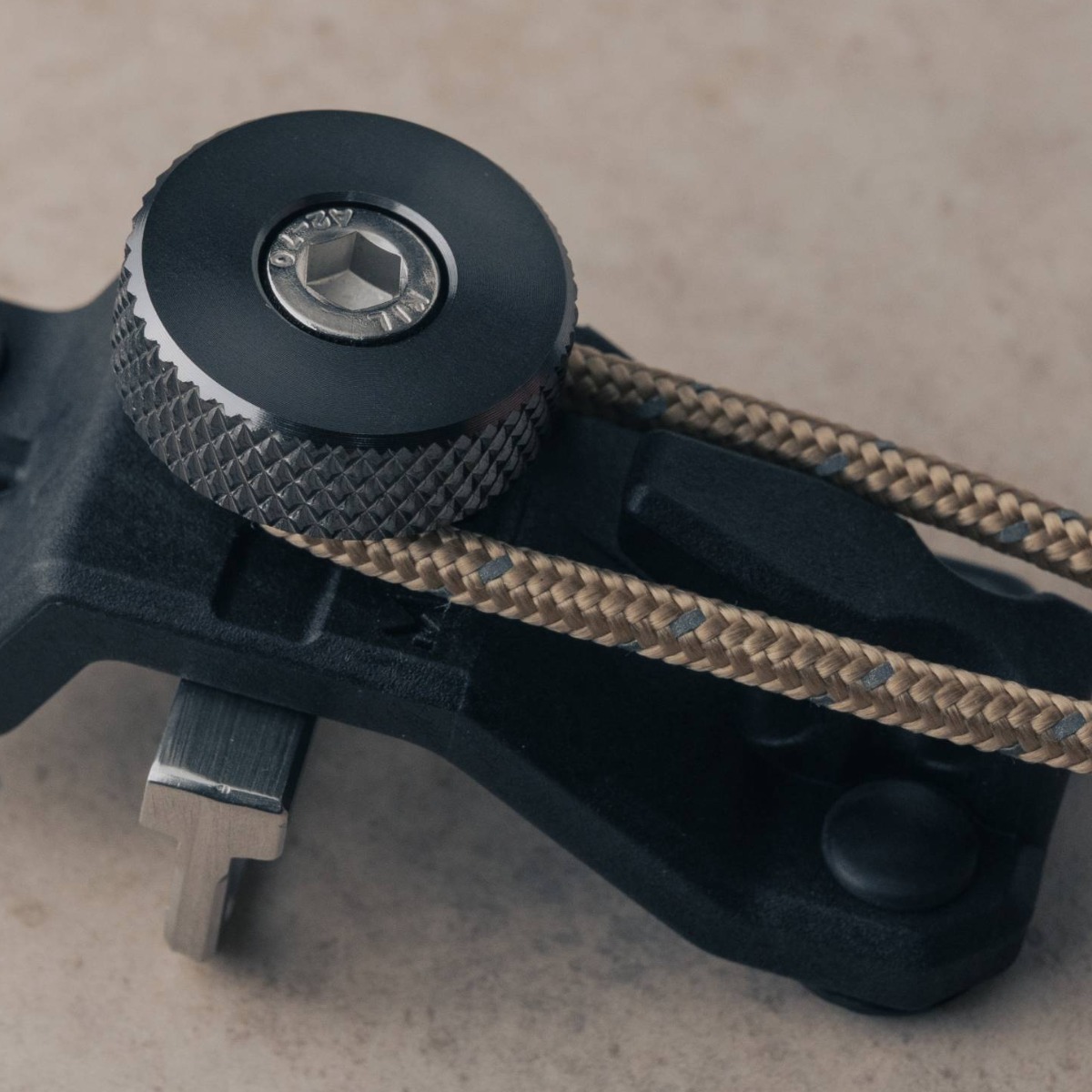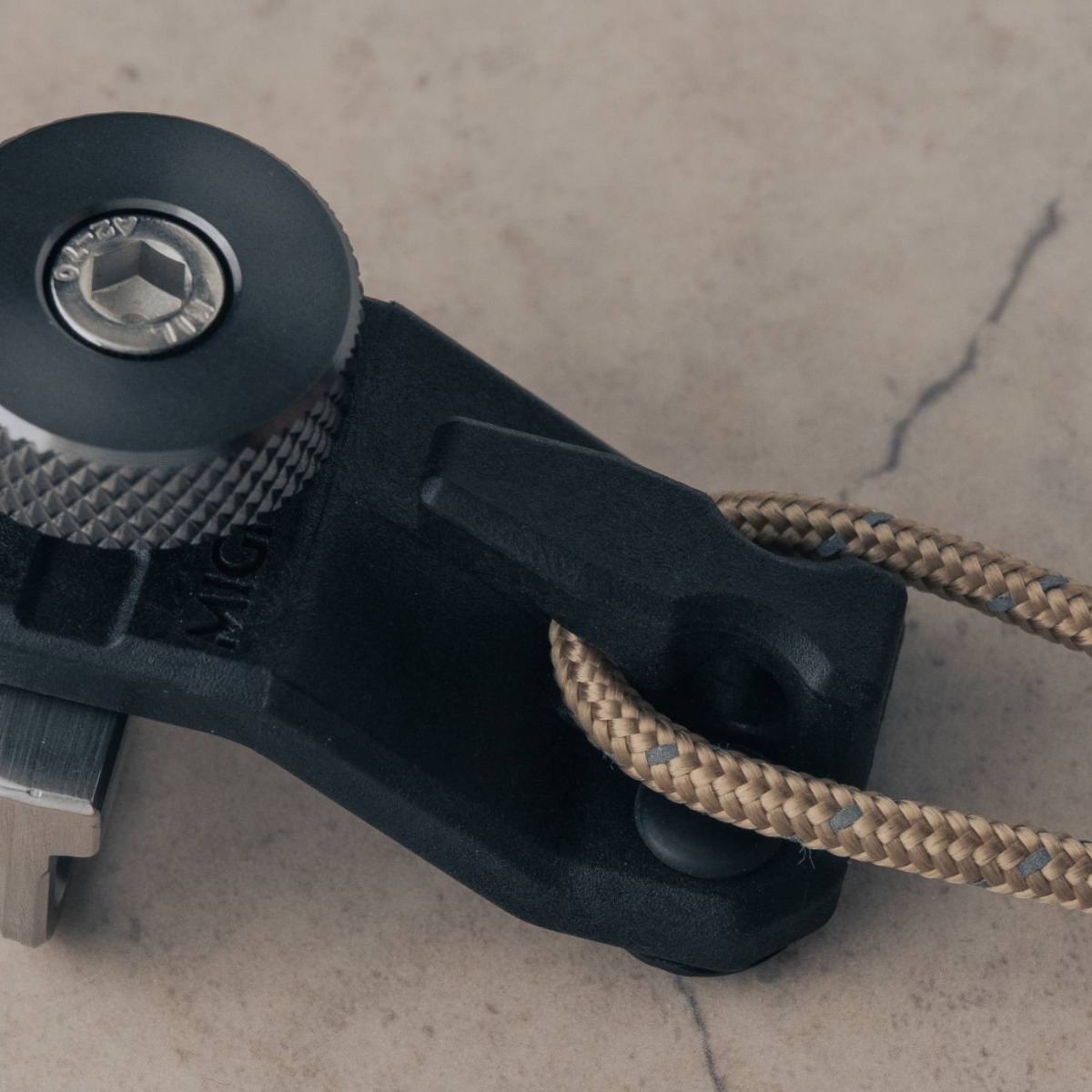 樹脂ボディの『フック』と『穴』、『締め付けノブ』の3カ所にガイロープやタープループなどを掛けることができる。