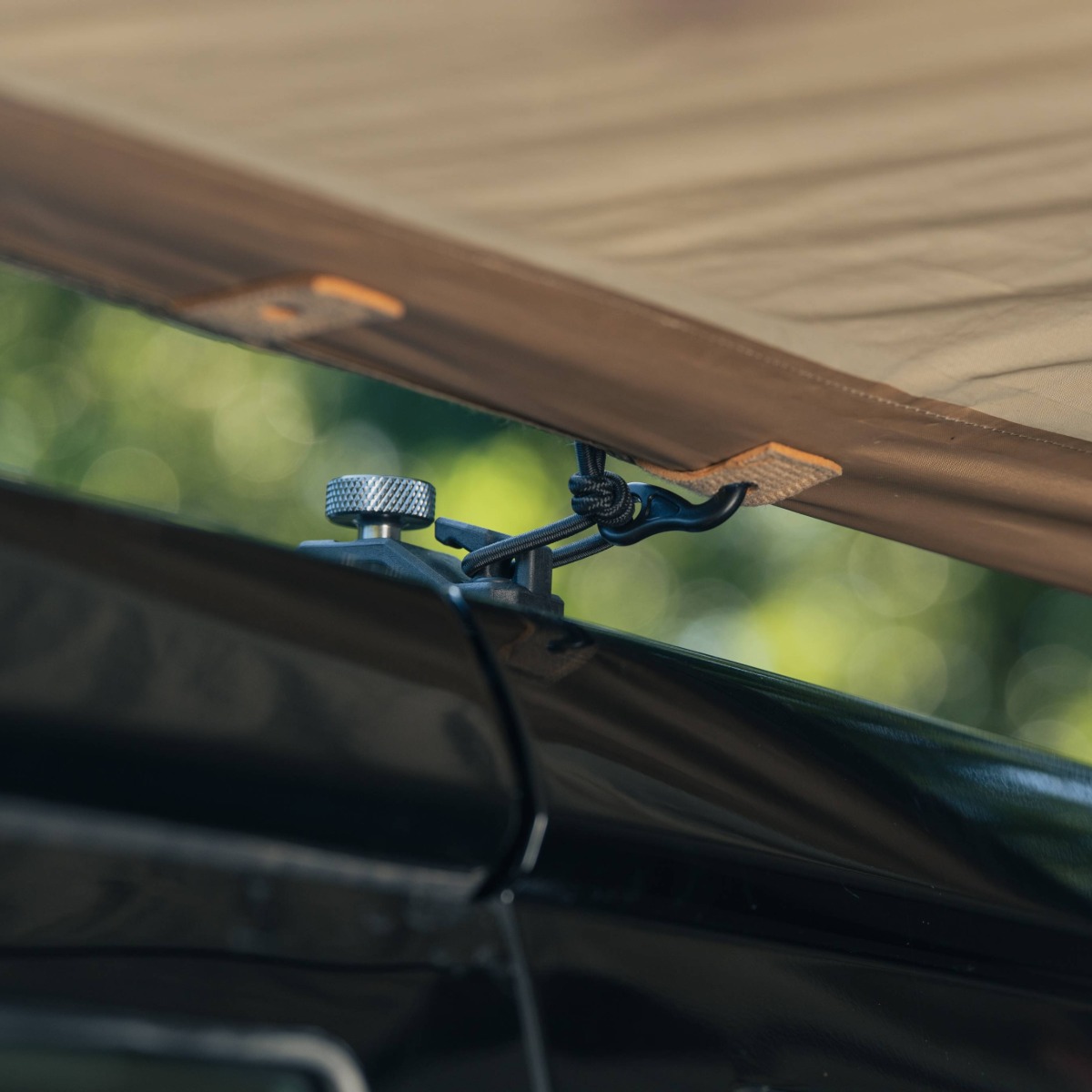 デリカ D5にタープやカーサイドテントを簡単・確実に取付けられる機能的なカージョイントフック。カーサイドでキャンプを楽しみたい人へ、スムーズなオーニング設置をサポート。