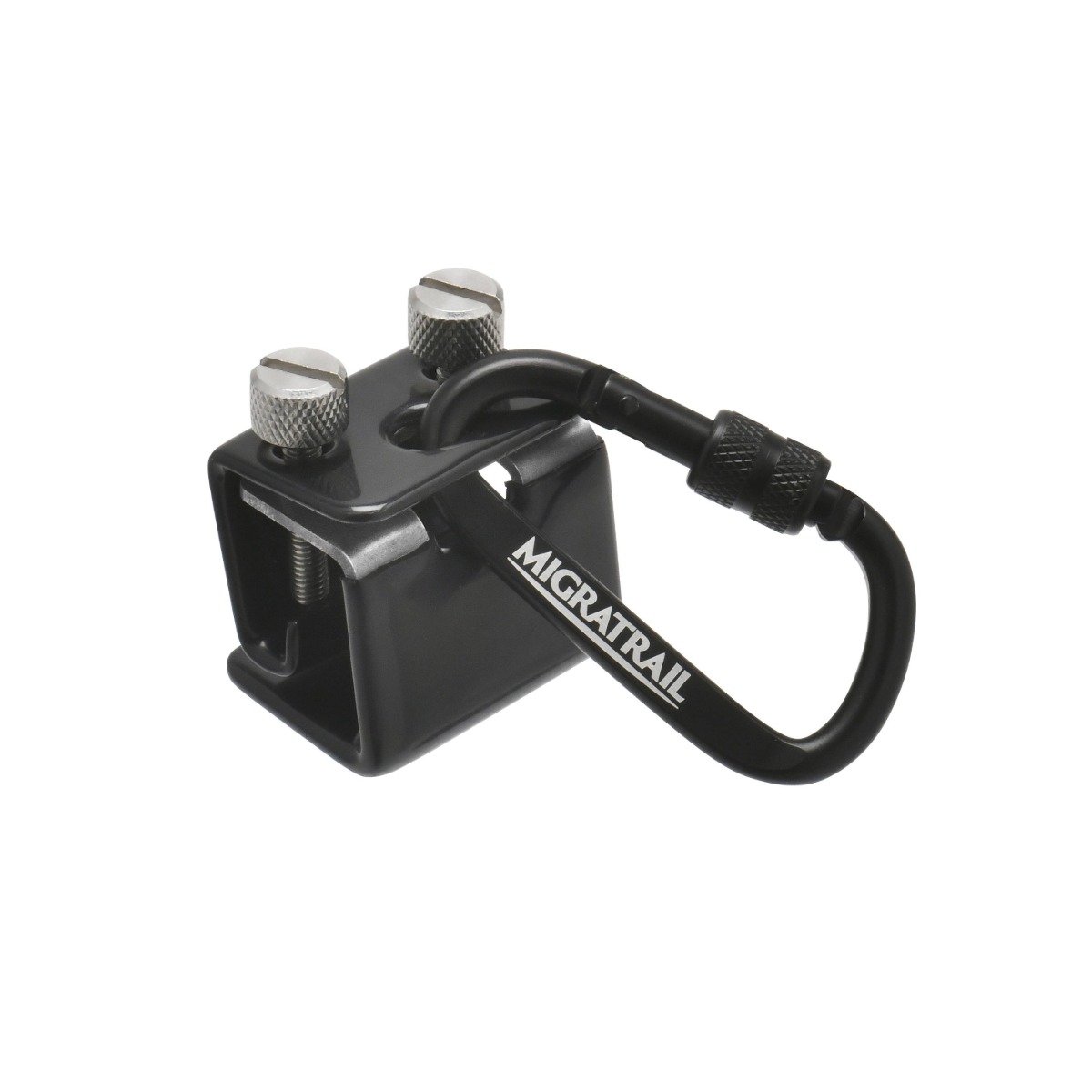 ジョイントとタープをしっかり連結出来るアルミニウム製カラビナを標準装備し、不意にタープが外れるのを防ぐ。MIGRATRAILロゴのレーザーマーキングを施す。