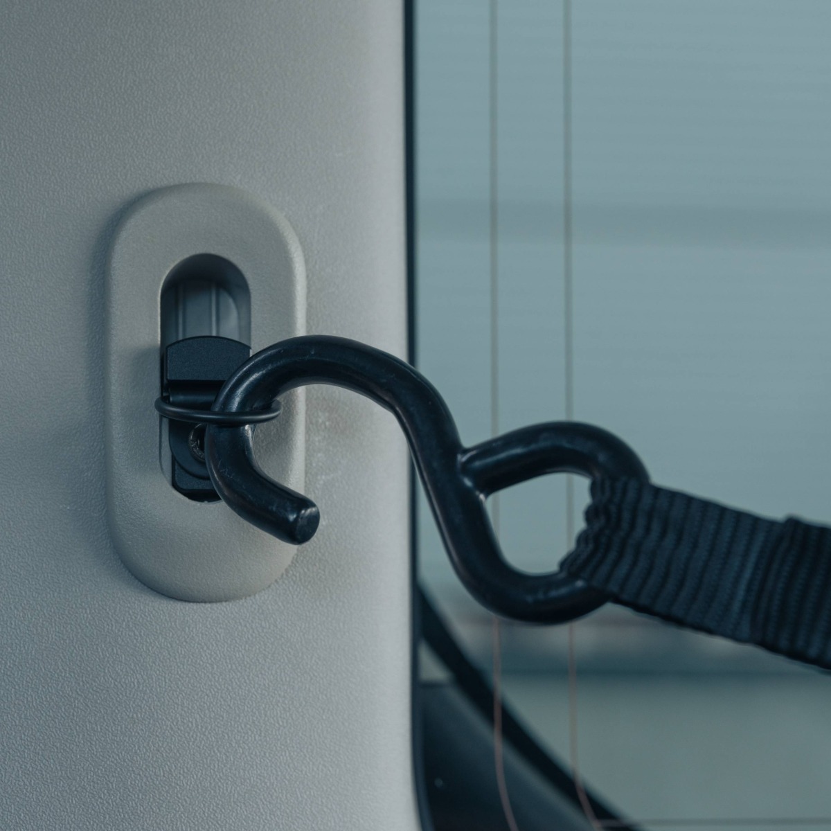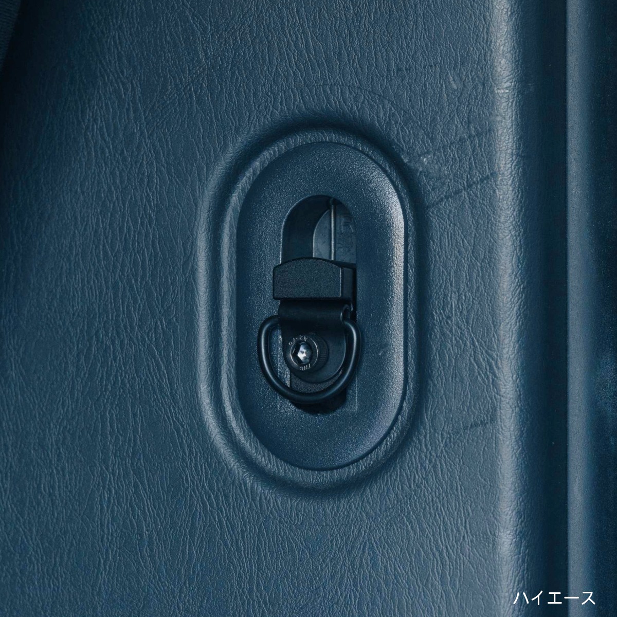 荷室の側面へ加工無しで簡単に装着できる荷掛けフック。便利な位置に荷掛けフックを増設でき、小物の吊り下げや自転車などの積載ができる。使い勝手の良いDカンタイプのフックを高品質に仕上げ、デザイン性を高めた。