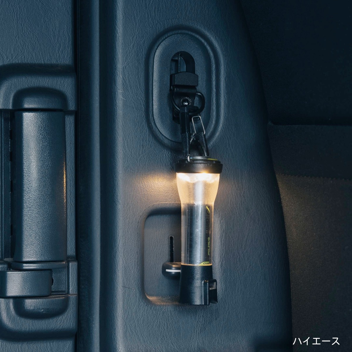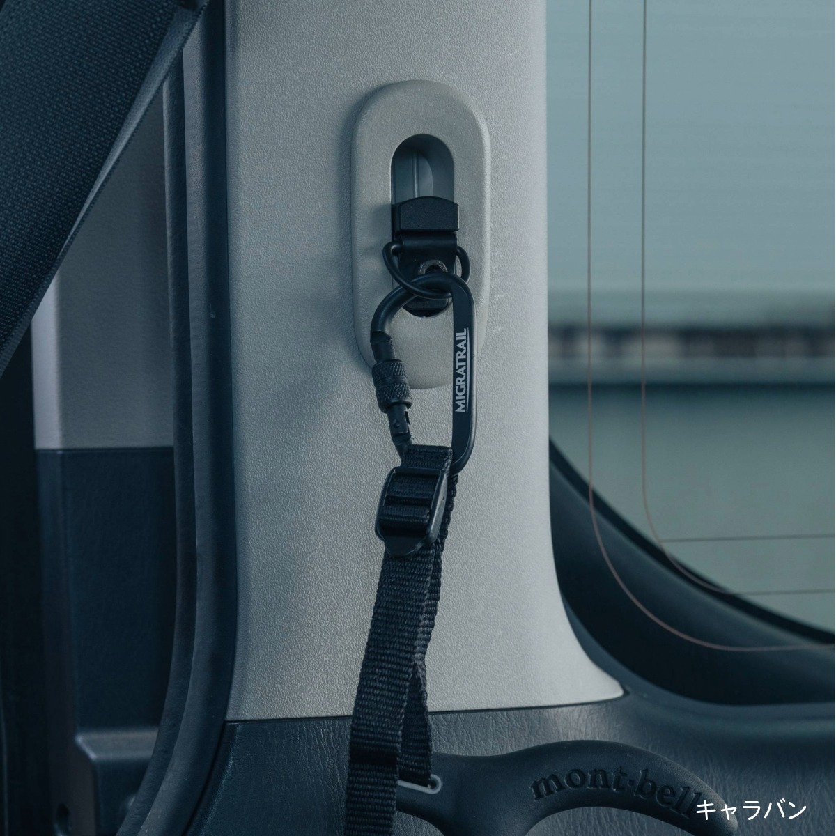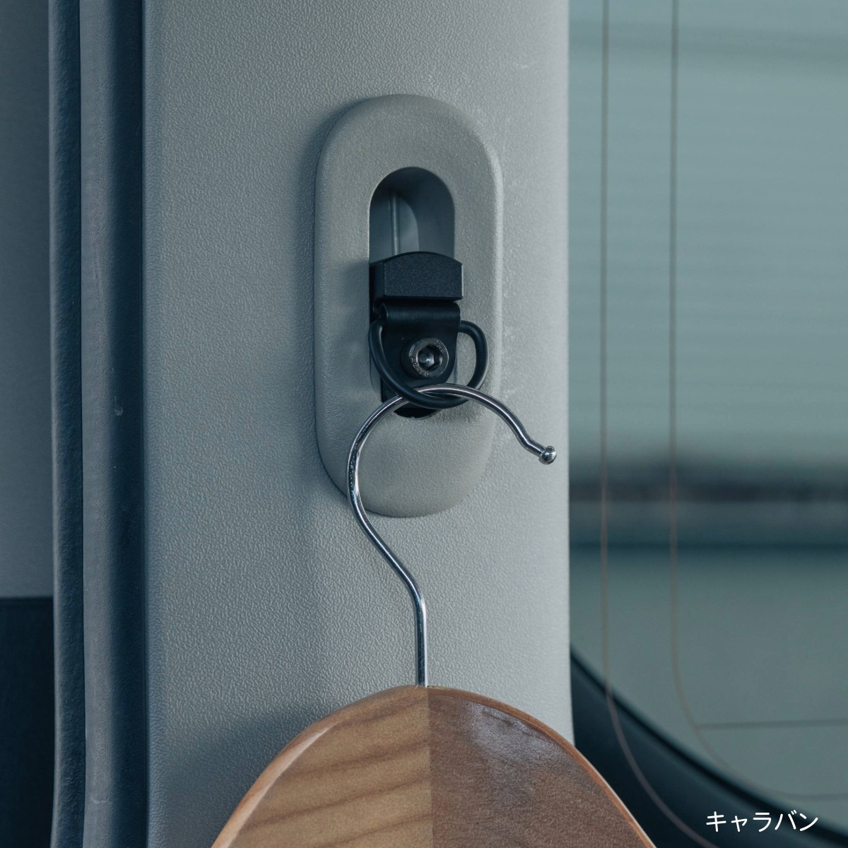 ワンボックスカーの室内の中でも利便性の高い位置にフックを設置でき、LEDランタンやハンガーなどの小物を掛けやすい。MIGRATRAILバンジーコードやタフフックを取付ければ様々な物を吊り下げられる。