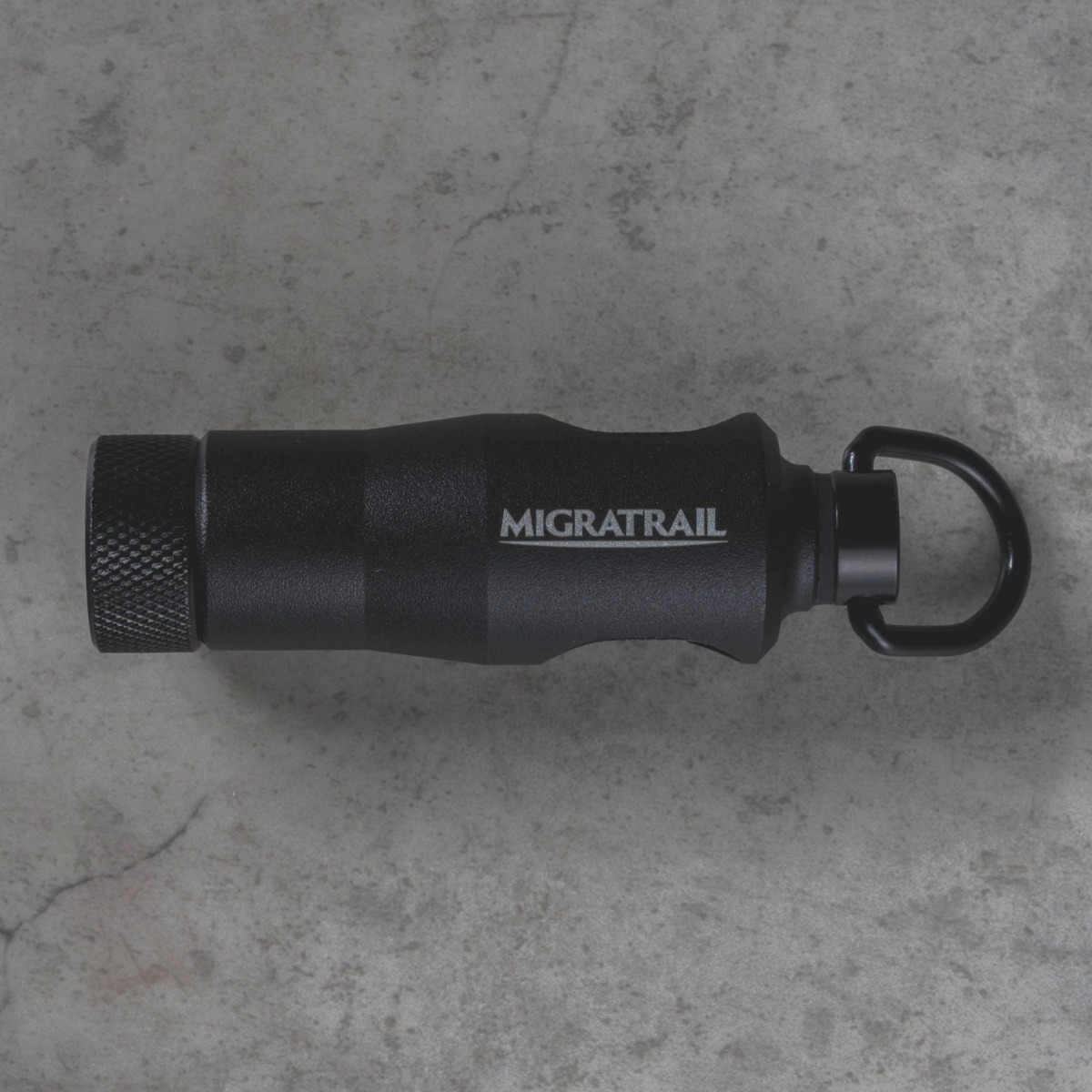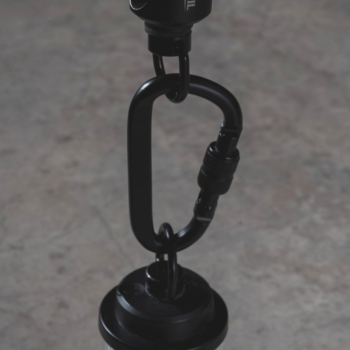 LEDランタンを使用する場合に、Dカンを外して直接フック部へ掛けることも出来る。また、カラビナなどを利用してDカンに掛けることも可能。