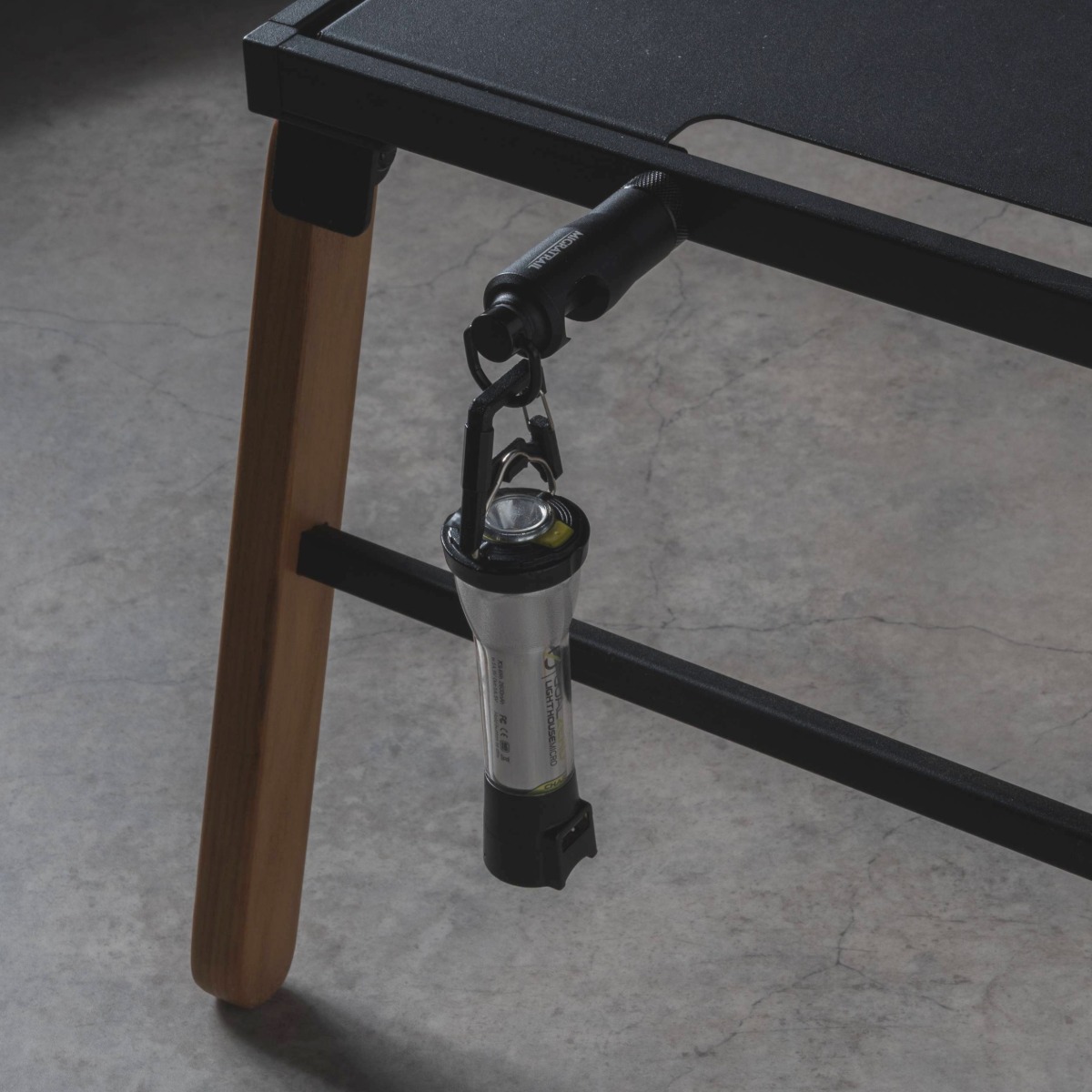 キャンプ用のアイアンテーブルへの取付けや、カメラスタンド&ペグを利用してランタンハンガーとして利用するなど、自分のアイデア次第で様々に変化する。