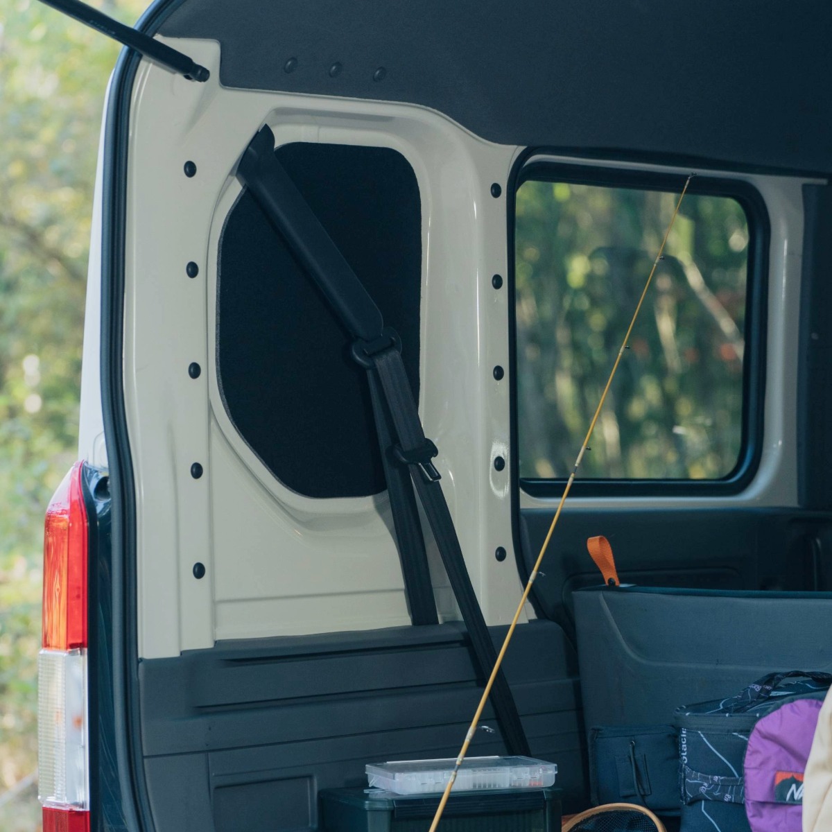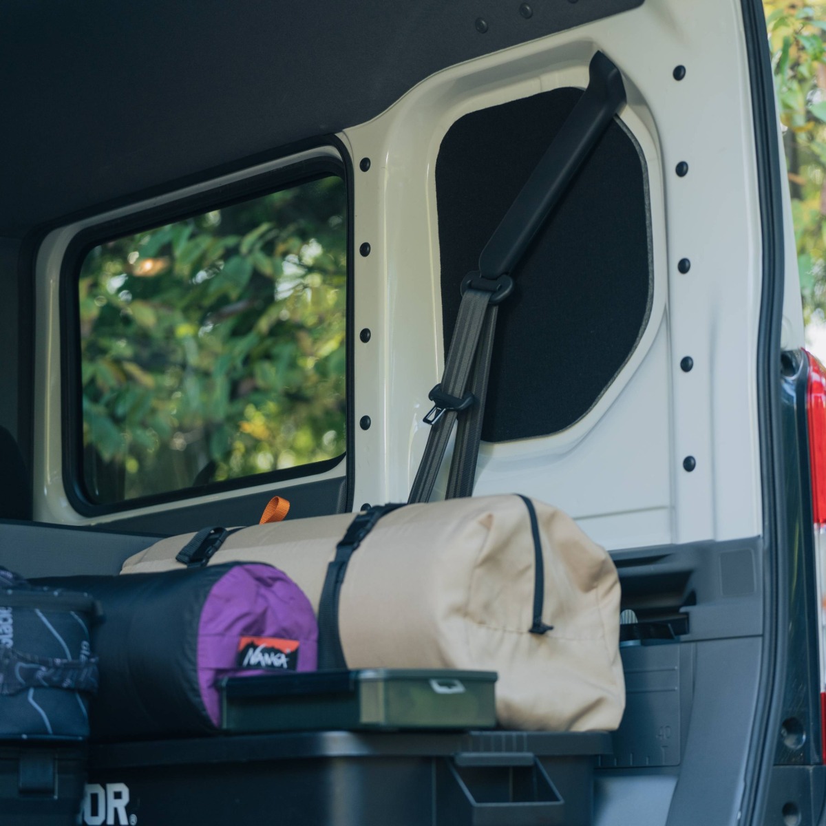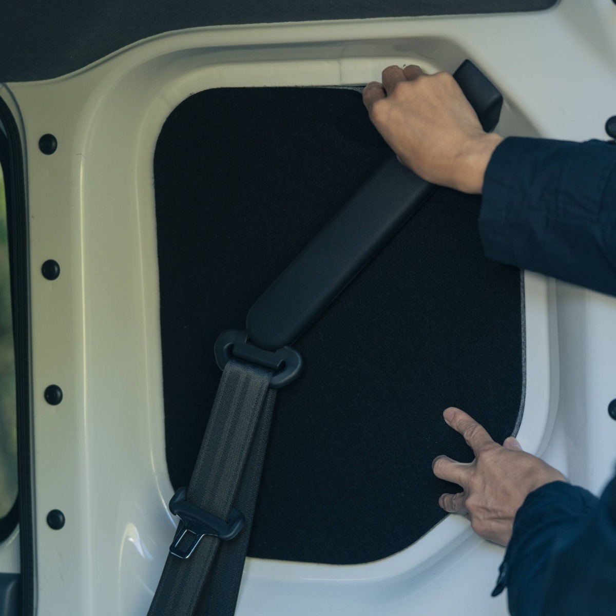 ラゲッジスペースのクォーターガラスを埋める左右セットのシェード。他にはない高い「断熱性」「防音性」を備え、快適な車内空間を提供する。窓とボディの間にはめ込むだけで簡単に装着でき、取付け痕もなくスマートな仕上がり。また、15mm厚の不織布マットはガラスの保護にもなる上、取付け後の匂いもない。