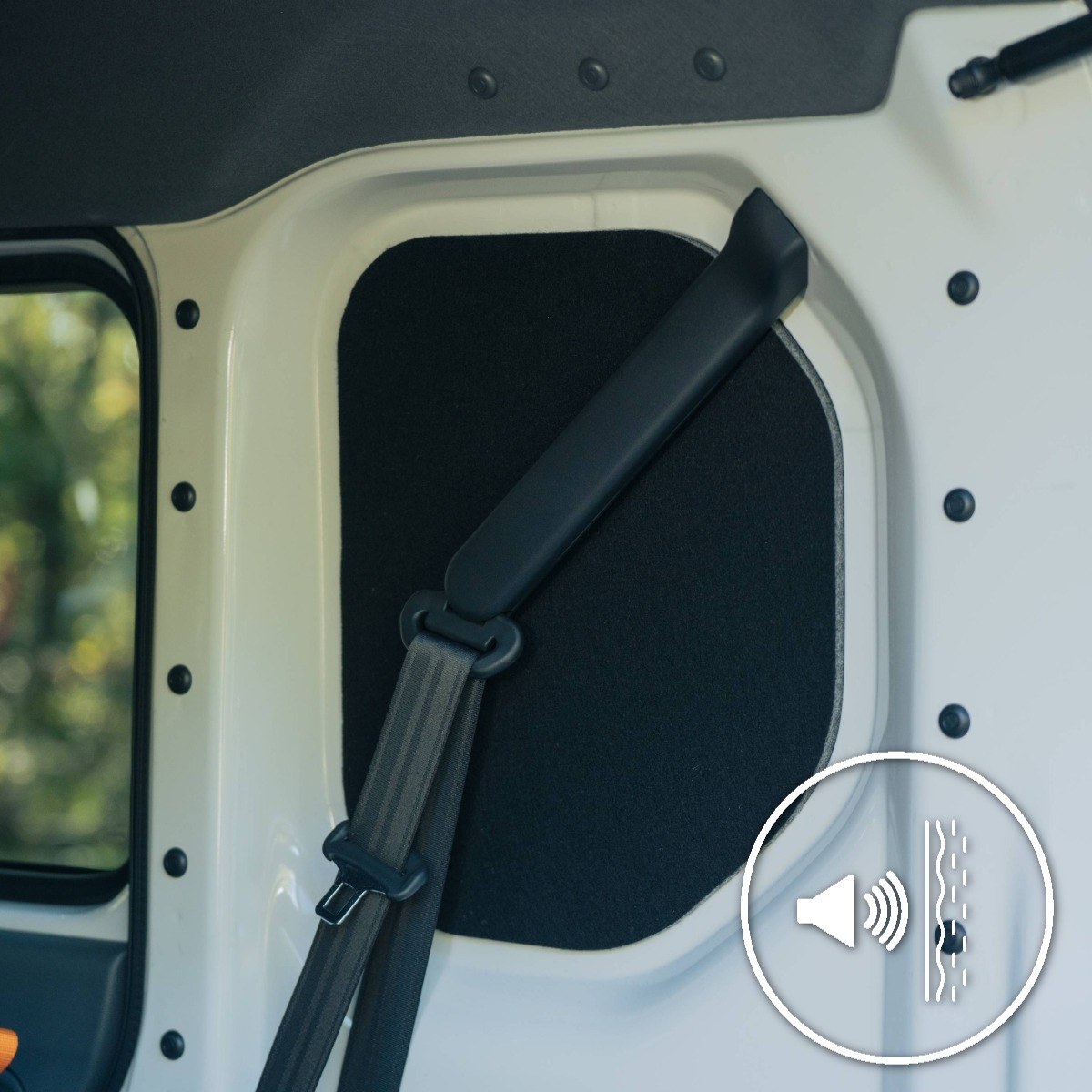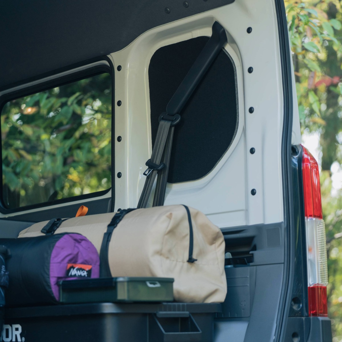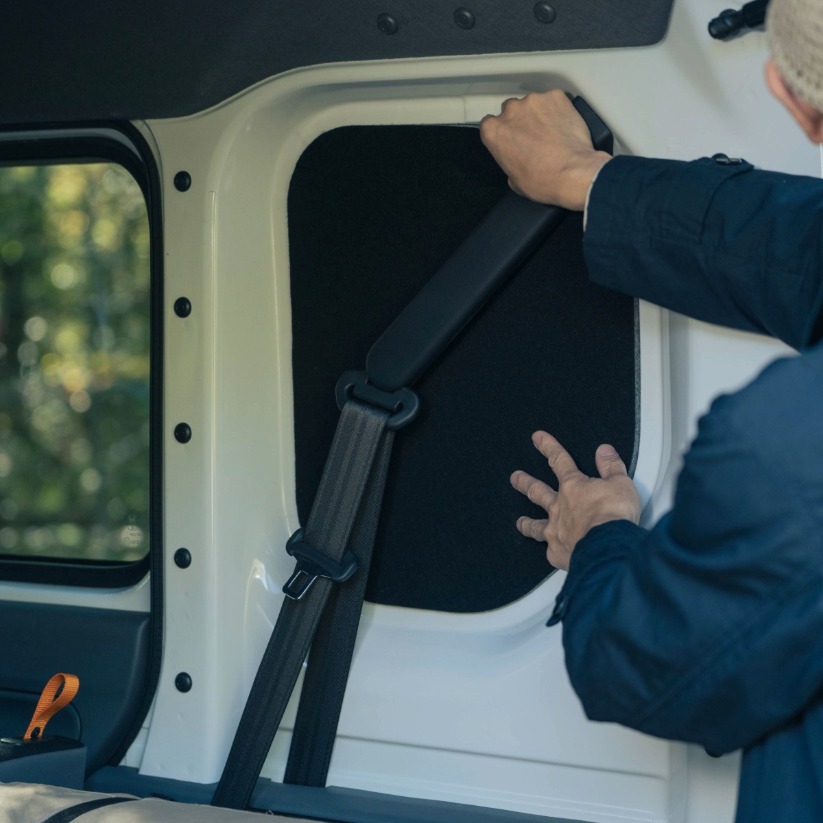 ラゲッジスペースのクォーターガラスを埋める左右セットのシェード。他にはない高い「断熱性」「防音性」を備え、快適な車内空間を提供する。窓とボディの間にはめ込むだけで簡単に装着でき、取付け痕もなくスマートな仕上がり。また、15mm厚の不織布マットはガラスの保護にもなる上、取付け後の匂いもない。