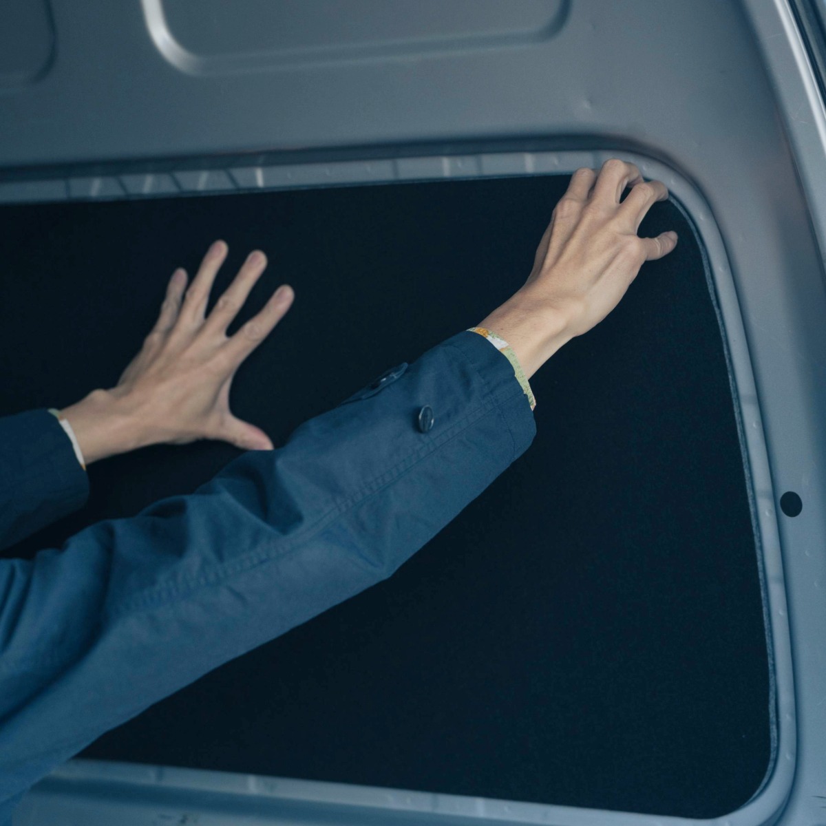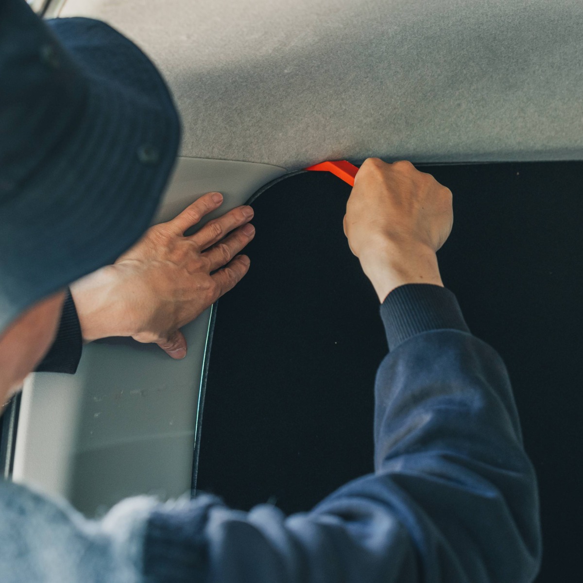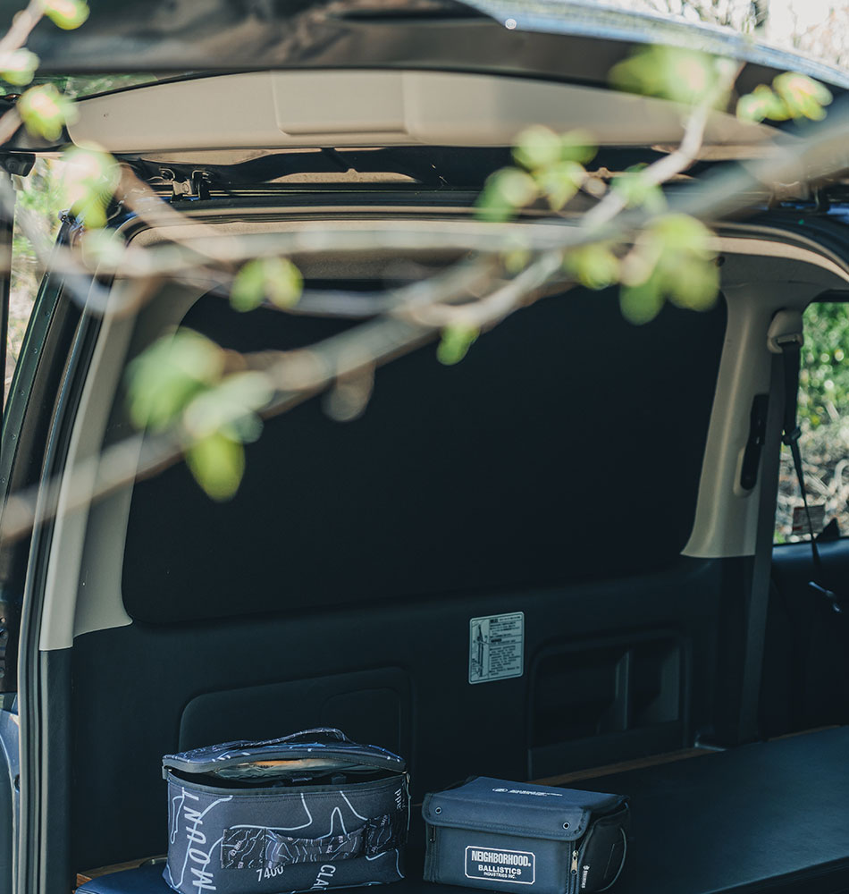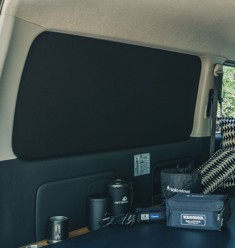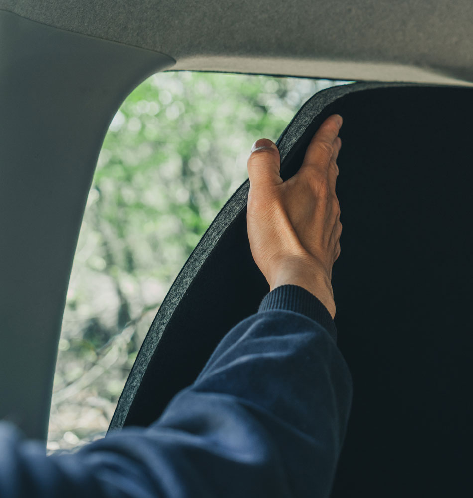 他には無い高い「断熱性」と「防音性」を備え、快適な車内空間を提供するシェード。精度高く窓枠に沿い切り抜いたシェードをはめ込むシンプルスタイル。はめ込み式の採用により、車体への加工を要さず取付け跡を残さない。