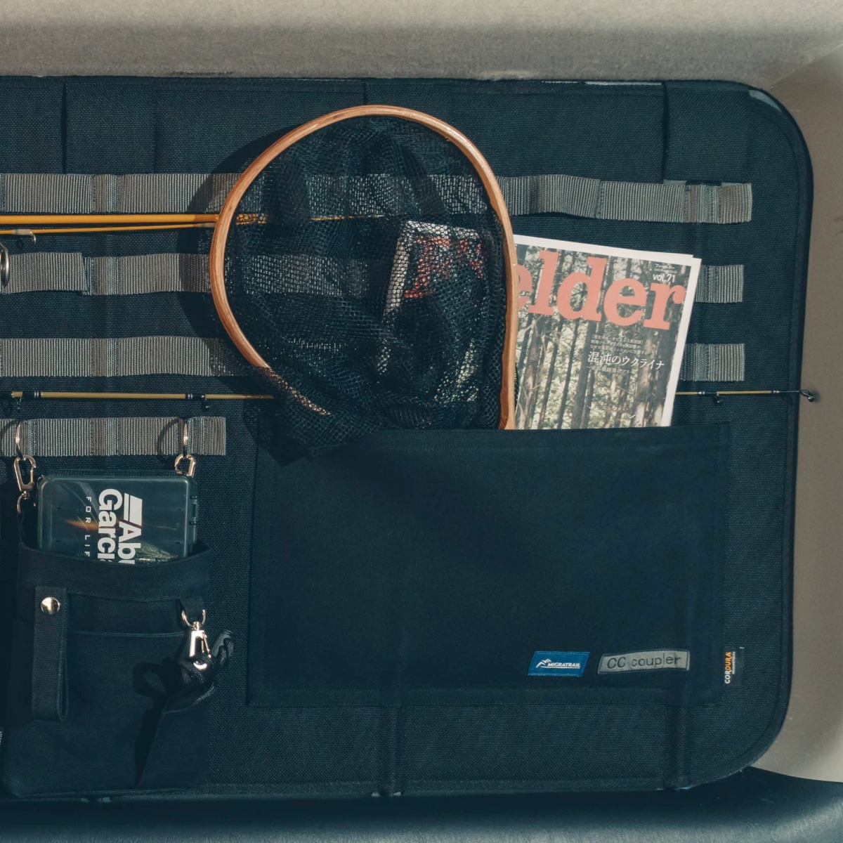ハイエース/キャラバンの荷室窓(クォーターガラス)を埋めるシェード。プライベートを確保し真夏の日差しや真冬の冷気を遮断させる。シェード内側に配置されたモールシステムにより、キャンプギアや釣り道具等を便利に収納し、バンライフを機能的なスタイルへ変える。大阪府にあるCCcouplerとミグラトレイルのコラボレーションモデルによる高品質な日本製。